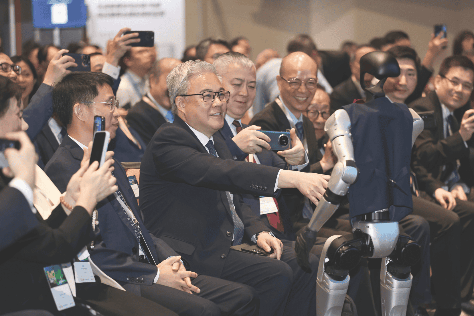 Mr Poon Kwok-ying, Raymond, Director of Electrical and Mechanical Services, interacted with a smart robot on the E&M I&T Day in a lively atmosphere. The event attracted over 400 participants from Hong Kong and other GBA cities who explored the prospects of E&M I&T together.